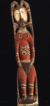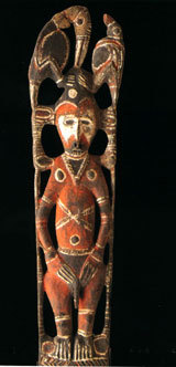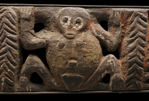 Pour ma part, je choisis de vous parler des arts d’Océanie paradoxalement parce que je n’en ai jamais parlé et parce que (un blog se devant de suivre l’actualité !) le Musée du Quai Branly n’a préempté qu’une seule oeuvre lors de la vente de la Collection Vérité : Un superbe linteau de Nouvelle Guinée (3,30m) dont les photographies ci-contre vous en découvrent les extrémités composées de deux personnages de belle polychromie, surmontés d’oiseaux.