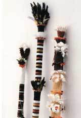 Dans une autre salle, on est intrigué par ces bâtons fichés dans le sol. Ce sont des objets réalisés là encore à l’occasion de rites funéraires et qui ont la capacité d’emmagasiner le pouvoir spirituel des défunts. Ils sont appelés «bâtons de cérémonie de l’étoile du matin» ou pôles de Barnumbirr. Une notice explique que Barnumbirr est le nom donné à l’étoile du matin qui n’est autre que la planète Vénus et que, «chaque matin avant l’aube, une fois la confection de l’étoile achevée, une vieille femme l’envoie dans le ciel au bout d’une longue ficelle. L’étoile se perche sur la cime d’un pandanus qui pousse sur l’île de Burralku. Comme la lumière du jour arrive, la vieille femme tire à nouveau sur la ficelle pour ranger l’étoile dans son panier jusqu’au lendemain».