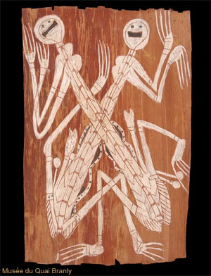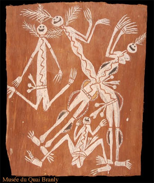 Il faut choisir une porte d’accès qui nous deviendra familière. La plus « simple» m’a paru être les peintures sur écorce de la Terre d’Arnhem. Beaucoup d’entre elles sont inspirées de l’art pariétal, telle cette dernière représentation d’un Mimi de la roche d’Ubirr dans le parc national de Kakadu, en Terre d’Arnhem. (Certaines peintures sur roches sont modernes, on parle alors de « style dynamique » plutôt que de « style mimi »).