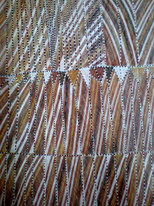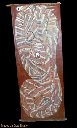 Ci-dessus est reproduit un détail d’une peinture, Mardayin Ceremony, 2000, conservée à la Art Gallery of New South Wales.