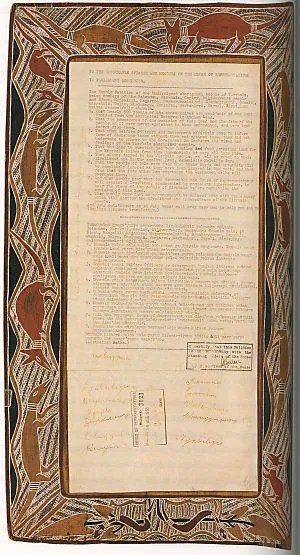 28 août 1963, suite à l’exploitation d’une mine de bauxite sur leurs terres, les Yolngu protestèrent et peignirent une pétition.