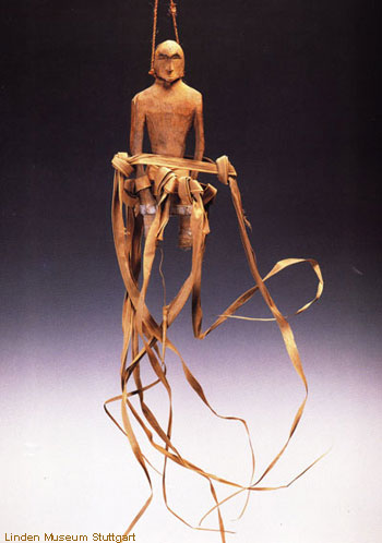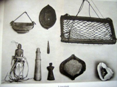 On remarque bien l’objet de gauche : une figure en bois surmontant des aiguillons de raies, l’attache réalisée avec des fibres, peut être des bandes de feuilles de palmier ou coco ; le bois et les piquants étant soudés par de la chaux.