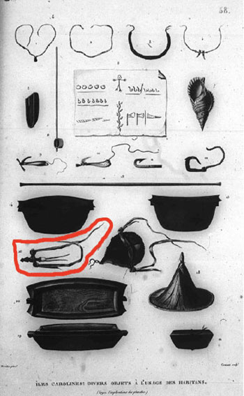 « Freycinet décrit planche 58 l’objet ossolifei qui servait à combattre les tempêtes. On pense qu’un piquant de raie dans l’embarcation l’empêche de s’égarer … j’ai découvert leur maniement sur les atolls centraux où la navigation en haute mer a été pratiquée jusqu’au début de notre époque, et où on la pratique certainement à l’occasion aujourd’hui encore » et plus précisément, Thilenius note : « … C’était un objet en forme de poignard, pourvu d’épines de raie, dont la partie supérieure était une figure janus » :