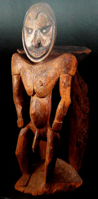 Ces deux objets ont été réalisés en région Iatmul, dans le Moyen-Sepik, et sont en fait des pupitres d’orateur ou teget. La figure du pupitre indique la présence de l’ancêtre du clan dominant de la Maison des Hommes du village.