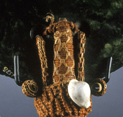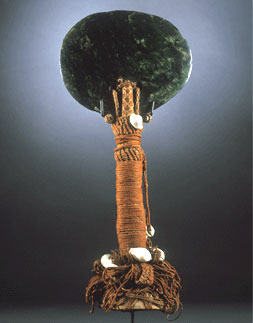 Cette hache (ci-contre), tout comme la première, présente un disque taillé dans la jadéite dont le manche est couvert de cordonnets de poils de roussette teints en rouge.