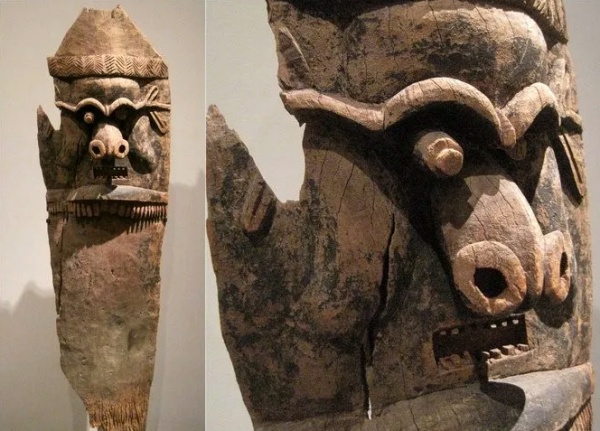 Cette chambranle présentée au Pavillon des Sessions est étonnante dans ses volumes, le nez particulièrement imposant, la bouche rectangulaire et ses dents, les yeux globuleux, les oreilles stylisées…