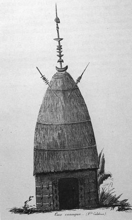 De forme ronde au toit conique, construite autour d’un poteau central qui soutient toute la charpente, et qui symboliquement représente le grand aîné soutenant tout le groupe social, la Grande Case était plus qu’une simple habitation de chef, elle était une métaphore du chef.