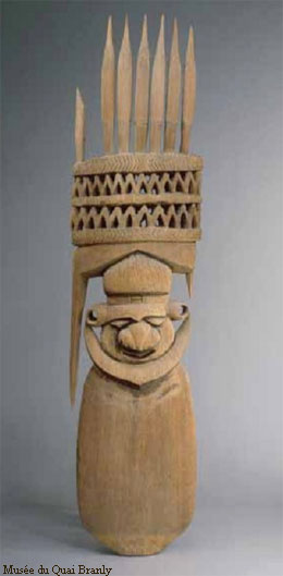 La sculpture faîtière constitue avec le masque, l’un des insigne remis au chef par les clans les plus anciens.