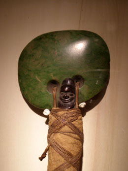 Les haches ostensoires,, dont le disque de néphrite ou serpentine est translucide dans la finesse de son contour, côtoient une fabuleuse collection de masques en bois de houp dont les nez crochus et les rictus interpellent.