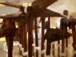 Des forêts de massues en forme de bec d’oiseau, mais aussi en forme de champignon, de forme phallique, se dressent, innombrables, dans les vitrines.