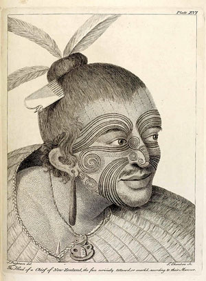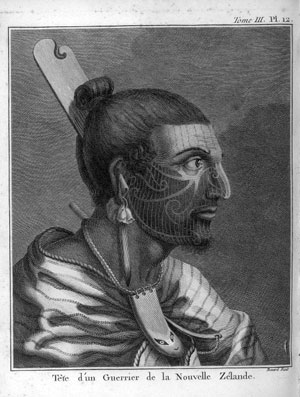 Portrait d’un chef Maori, 1769, dessin de S. Parkinson accompagnant le 1er voyage de Cook.