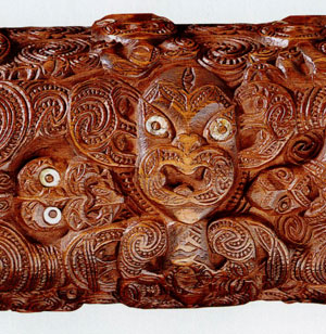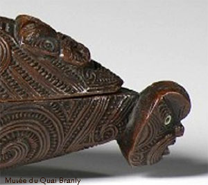 Poursuivant l’étude de quelques oeuvres de l’art Maori, nous sommes frappés par la richesse des décorations de certaines boîtes à couvercles dont les surfaces sont entièrement gravées d’un enchevêtrement de motifs spiralés.