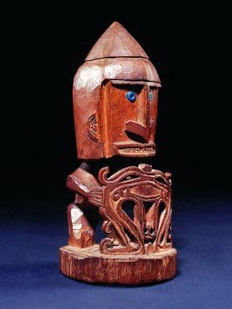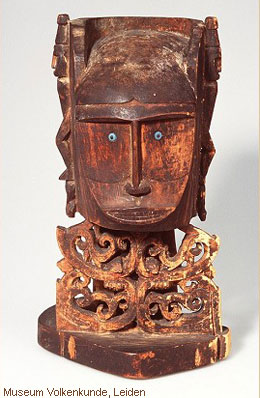 Dans le golfe de Cenderawasih, anciennement baie de Geelvink, l’on trouvait des petites statuettes en bois monoxyle, anthropomorphes, composées d’un personnage assis derrière un écran-bouclier ajouré qu’il tient de ses deux mains et sur lequel, parfois, appuie son menton.