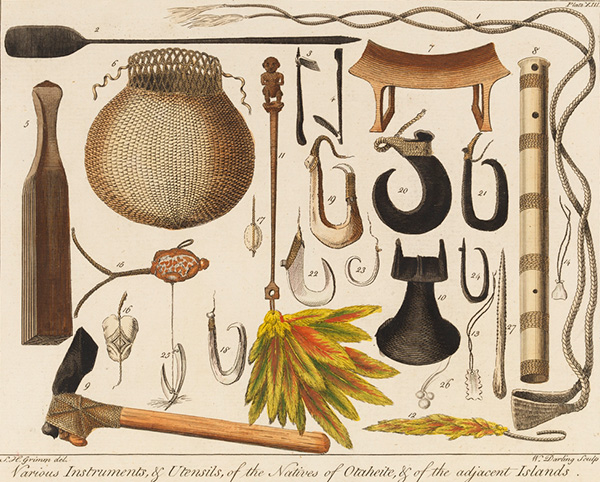 À partir des travaux des différents dessinateurs des trois expéditions ; notamment ceux de Sydney Parkinson, William Hodges, John Webber et encore ceux de George Forster, mais aussi d’autres dessinateurs non présents à bord des navires (ici Grimm), nous retrouvons les objets polynésiens collectés et éparpillés de nos jours dans différents musées.