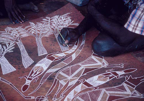 Photo 1 : Contemporary Aboriginal artist at Gunbalanya (Oenpelli) painting an image of a lizard with X-ray features. Such paintings reflect an unbroken continuity with the ancient X-ray tradition. The Metropolitan Museum of Art.