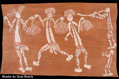 Les peintures corporelles, les objets rituels, les dessins sur le sable, les écorces et les acryliques sur toile sont en effet emblématiques d’êtres ancestraux. Nous essayerons de comprendre en quel sens.