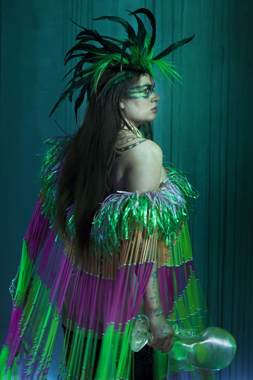 Photo 3 : Rave on Maiden. Impression digitale sur dibond Perspex AO : 841*1189. Photographie : Terry Brown. Plexiglass Wahaika sculpté par George Nuku. En collaboration avec Amada Luise Barnes. © Rosanna Raymond