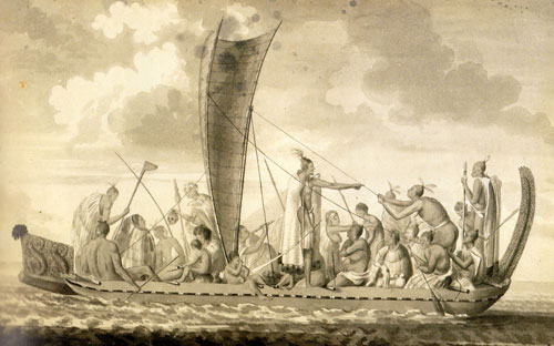 Le dessin de Sydney Parkinson est riche d’enseignements sur les oeuvres maori : Canoë à la proue et à la poupe décorées de motifs curvilignes, personnages enveloppés dans de riches manteaux tissés et portant pendants d’oreilles et plumes, homme jouant de la flûte sans parler d’un crâne humain que tend un guerrier…
