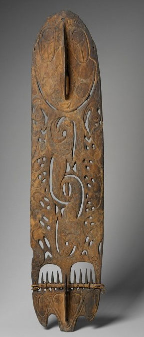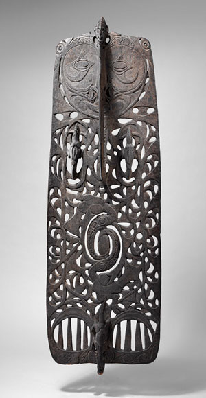 Ce type de planche fonctionnait comme une statue d’ancêtre : lorsque des crânes étaient attachés sur les chevilles verticales situées en partie inférieure de la planche, la sculpture devenait un objet sacré dont l’énergie devait renforcer les pouvoirs de la communauté.