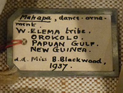 Chaque objet est une histoire à lui seul, les étiquettes racontent des vies telle celle de Béatrice Blackwood qui rapporta un grand nombre d’objets de ses terrains en 1929 dans les îles Salomons, puis en 1936 chez les Anga de Nouvelle-Guinée et les Arawe de Nouvelle Bretagne.
