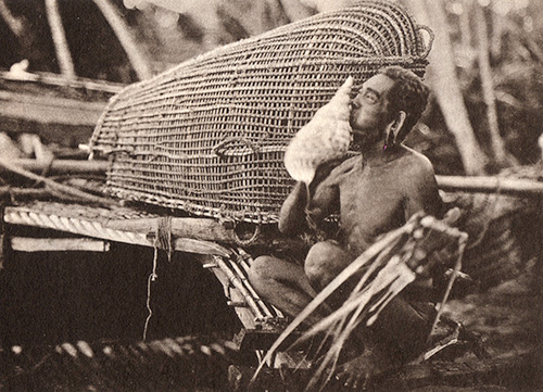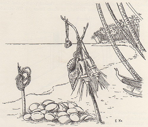 po, un navigateur de Lamotrek soufflant dans une conque et tenant de sa main gauche un charme de navigation in Krämer, Augustin, Ergebnisse der Südsee-Expedition 1908-1910, Hrsg. Thilenius, G., Vol. II Ethnographie: B Mikronesien, Bd. 10, Zentralkarolinen, I. Halbband, Hamburg 1937, Plate 4, c, Kr. 377