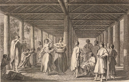 Photo 3 : Intérieur d’une maison de l’île de Ulietea avec la représentation d’une danse accompagnée de la musique du pays, 1773, gravure de John Hawkesworth.