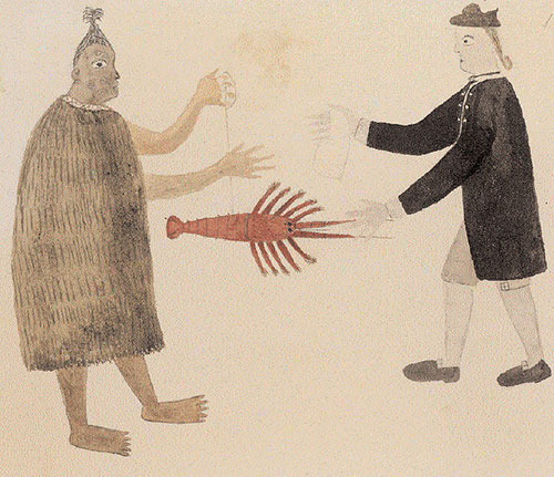 Photo 2 : Aquarelle de Tupaia : « Joseph Banks receiving a crayfish in Uawa », 1769 – © British Library.