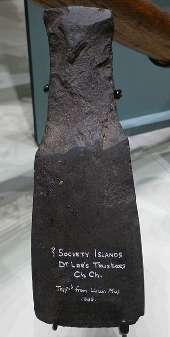 Dans la première liste, on remarquera un objet étonnant : l’écope de pirogue maorie (comportant l’étiquette sur laquelle on peut lire sur le manche la fameuse inscription Dr Lee’s Trustees Ch. Ch). Sur le dessous, on trouve encore quatre réparations indigènes et un morceau d’étiquette où il y serait inscrit Scoop for bal[ing] out Can[oe].