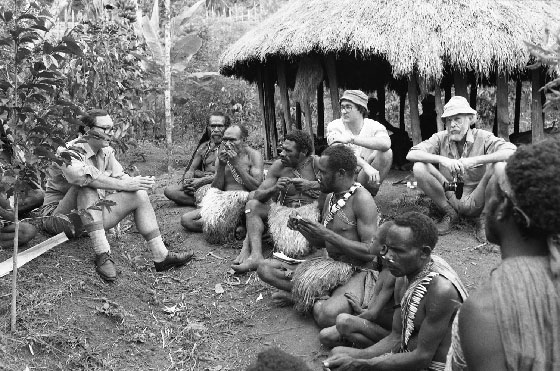 Photo : Quelques jours avant le début des cérémonies muka (premier stade des rites masculins) Maurice Godelier discute avec les experts rituels baruya des conditions futures de visionnage et d’utilisation des images tournées par Ian Dunlop. De gauche à droite : Maurice Godelier, Dawatnie, Tsunuandaye, Yaruemeye, Djiravenniac, Gandjakwe ; en arrière plan : Jean-Luc Lory et Ian Dunlop. Wonenara, juin 1979.
