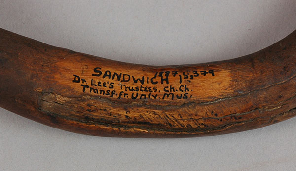 Photo : Détail d’un hameçon maori. Etiqueté par erreur Sandwich Islands. Collecté par Joseph Banks (1er voyage). Mention Dr. Lee © Pitt Rivers Museum n°1886.1.379