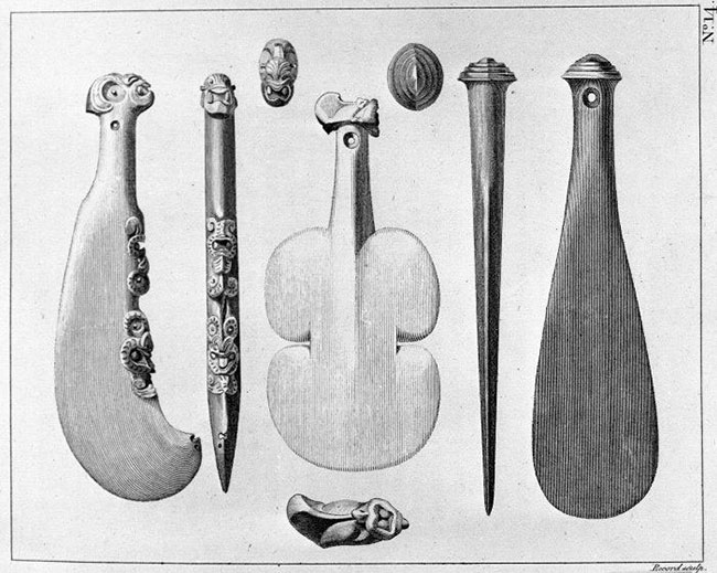 Parmi les objets collectés lors du premier voyage de Cook et que Jeremy Coote a identifiés dans les collections du Pitt Rivers Museum, on trouve cinq armes maori (les Wahaika, Kotiate et Patu) : trois en bois, une en os de baleine et une en basalte.