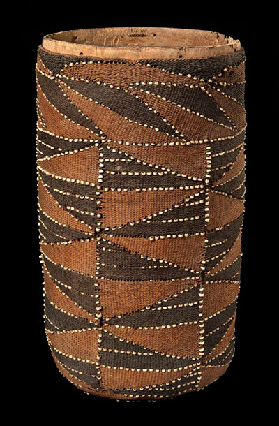 Des dessins sont formés à l’aide de perles de coquillages. Ici, il semble que les motifs représentent deux oiseaux volant ensemble, métaphore pour une personne de haut statut dont les parents sont également de rang élevé. Ces paniers étaient destinés à abriter des objets personnels, d’autres servaient de présentation de matériaux parfumés et décoratifs lors de mariage ou de funérailles.