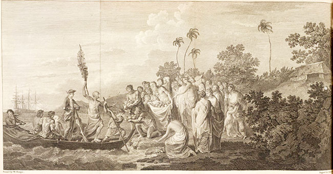 Photos : Gravure The landing at Middleburgh one of the Friendly Isles à partir du dessin de William Hodges et détails.
