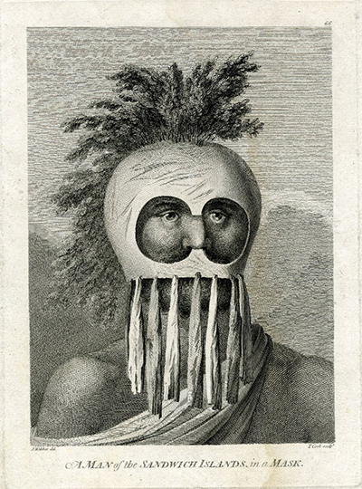 Photo 2 : A Man of the Sandwich Islands, in a Mask, gravure de 1874 d’après un dessin de John Webber © The British Museum Oc2006,Prt.203.
