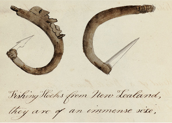 Il existe peu d’hameçons maoris présentant de si belles sculptures réalisées avec ce qu’on appelle des outils « pré-contact ». L’une des premières représentations de ce type a été faite par Sydney Parkinson lors du premier voyage (cf. photo ci-dessus à gauche) ; la figure sculptée est celle d’un manaia, une créature hybride avec un corps d’homme et une tête d’oiseau, à la fois messager et gardien.
