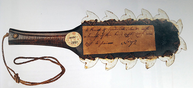 A contrario, le couteau scarificateur d’Hawaii présenté ci-dessus (1882.3664) et comportant douze dents de requin, est un des objets assez bien renseigné puisqu’il a conservé une ancienne étiquette où l’on peut lire « A Knif of Sandwich Islands. with a knif of this kind Capt. Cook was cut to pieces. N°72 », une inscription qui semble-t-il a été écrite de la main de Digby. Cet outil a vraisemblablement été donné par le Capitaine King. On pourra rapprocher ce type de couteau de leurs semblables, plus sculptés, qu’on trouvait en Nouvelle – Zélande (1).