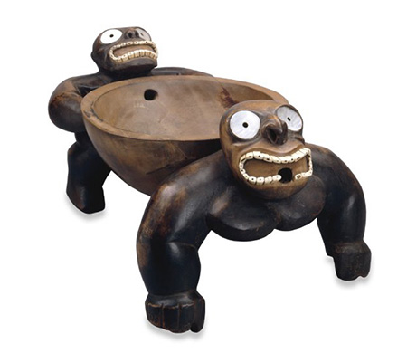 Les pièces les plus spectaculaires appartenant au British Museum sont sans aucun doute le costume de deuilleur de Tahiti (TAH78), les capes et les casques de Hawaii (HAW133, VAN234, HAW106, VAN236, HAW108), les effigies hawaïennes (HAW78, LMS221, VAN231), le bol incroyable avec ses deux têtes aux bouches béantes sur une dentition en tronçons de défenses de sanglier et qui fut offert au Capitaine Clerke par le chef de Kaua’i en janvier 1778 (HAW46, photo ci-dessus), des trésors maoris (Reiputa NZ159, Heru NZ163), le Heitiki HM Queen Elisabeth II qui fut donné par Cook au roi George III) ou encore la main en bois de l’île de Pâques (EP321).