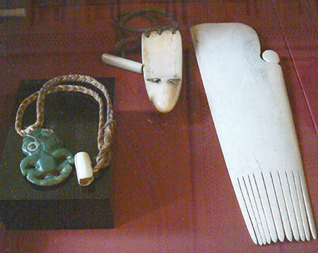 Photo 4 : Reiputa NZ159, Heru NZ163 et Heitiki HM Queen Elisabeth II qui fut donné par Cook au roi George III © The British Museum, photo de l’auteure 2008.