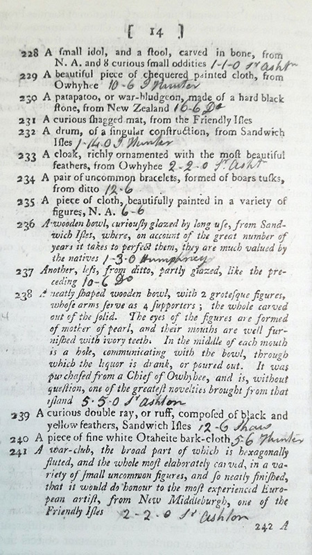 Dans les ventes précoces, on peut noter celle de George Jackson qui fut assistant charpentier sur la Resolution lors du second voyage. Elle eut lieu après son décès, le 14 mars 1776 et comprenait 240 lots. On remarquera par exemple sur la page 4 reproduite ci-dessus les annotations qui prouvent que certains lots furent bien achetés par Lever. (On peut ainsi remarquer le lot 21, un collier des Tonga, le lot 29 composé d’un chasse-mouche et d’un éventail de Nouvelle Calédonie et encore le lot 31 composé d’un arc et des flèches néo-calédoniens).