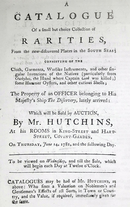 Une autre vente précoce qui a compté, malgré un plus petit nombre d’objets à la vente, fut celle du chirurgien David Samwell à bord de la Resolution lors du troisième voyage (ci-dessus la couverture du catalogue de la vente).