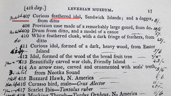 C’est en effet au cours du quatrième jour de vente que le lot 407 fut acquis par Fichtel missionné pour l’occasion par l’empereur d’Autriche. Ainsi c’est pour la somme de 8 schillings que lui furent adjugées cette idole emplumée et une dague.