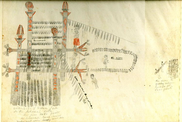 En contre point des statues monumentales, l’exposition présente de délicats dessins, tels ceux de Ahuia Ova, un chef Koita, informateur de Seligman. Ici, il s’agit d’une estrade cérémonielle avec des ignames entassés dessous et des bananes accrochées ; des femmes s’affairent ou dansent autour.