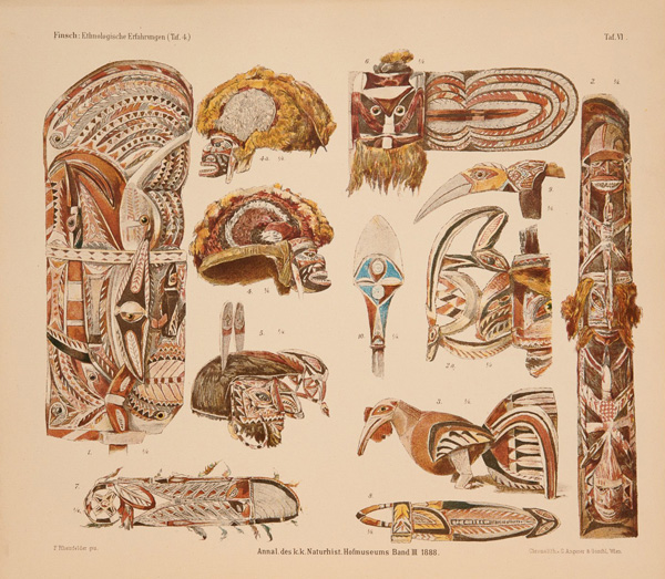Les collections du Weltmuseum de Wien sont ainsi riches de 26 carnets de voyage, de nombreux manuscrits, de croquis et de dessins au crayon de couleur, ainsi que d’une belle collection d’artefacts recueillis en Micronésie lors des voyages de Finsch des années 1880 puis en Papouasie notamment en 1884.