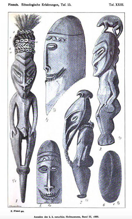 Outre son rôle de simple collecteur d’objets, Otto Finsch était un excellent illustrateur : Son ouvrage sur ses objets déposés au museum d’histoire naturelle de Vienne Ethnologische Erfahrungen und Belegstücke aus der Südsee : Beschreibender Katalog einer Sammlung sera publié en 1893 et fournit de nombreux et précieux dessins.