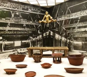 Dans la photo ci-dessous prise dans l’ancien musée ethnographique de Berlin-Dalhem en 2015, si la figure de pignon de Palau a été collectée par Schlaginhaufen en 1909, la majorité des bols proviennent de collectes de Kubary. (1886)