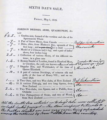 Un autre grand acheteur de la vente Bullock fut un certain Lichtenstein qui était un professeur d’histoire naturelle et qui devint le directeur du musée zoologique de Berlin. On pense que ses objets sont conservés au Musée ethnographique de Berlin mais rien de bien sûr car une grande partie de la documentation fut détruite pendant la guerre, et des objets demeurent introuvables…