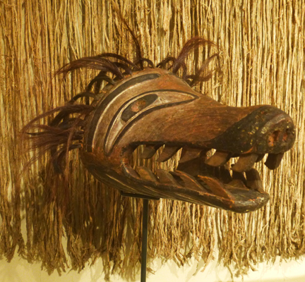 Masque étonnant et superbe chapeau de Nootka Sound avec des motifs en rapport avec la pêche que l’on avait pu admirer grâce aux dessins de John Webber mais aussi celui de Philippe Jacques de Loutherbourg.