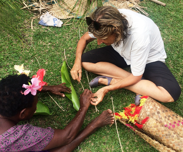 Par une belle journée d’août, nous débarquons dans la petite île de Mioko dans les îles du Duc d’York. À l’ombre d’un jardin, un groupe de femmes enfile patiemment de petits coquillages pour fabriquer de longues brassées qui seront revendues sur le marché de Kopoko… Je m’essaye bien maladroitement à la tâche, m’apercevant plus tard qu’une des femmes désenfilera mon travail probablement trop imprécis… Cette patience du travail manuel est propice au bavardage.