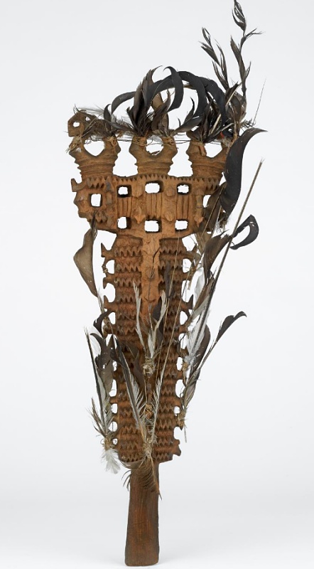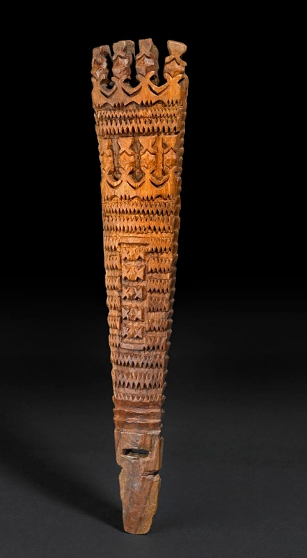 Dans l’exposition Oceania présentée à Londres en 2018, l’on pouvait admirer cette curieuse figure féminine dont le corps, les membres, la tête sont ornés de motifs peints, et normalement conservée au Museum fünf Kontinente de Munich. Celle-ci provient d’Aitutaki, une des îles du groupe du sud des îles Cook, déjà évoquée (article 7) avec Atiu, Mitiaro, Mangaia. Nous avons déjà mentionné des oeuvres anciennes d’Aitutaki sous la forme de bâtons ajourés, dentelés, avec des motifs de zigzags en reliefs. Les trois bâtons ci-dessous, conservés au British Museum, en constituent de parfaits exemples ; mais une telle représentation féminine de près de 60 cm de hauteur… voilà une chose bien plus rare !
