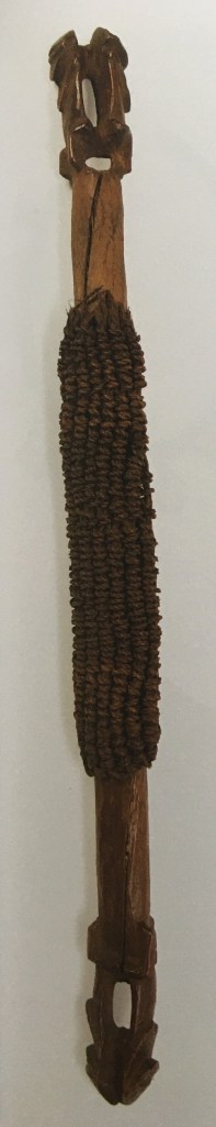 Cet objet combine en effet plusieurs styles. Il ressemble d’une certaine façon à un to’o avec une âme en bois entourée de sennit. Cette « gangue » doit probablement contenir des plumes rouges, des dents, des cheveux, ou peut-être et encore des ongles de défunts de haut rang. Mais l’âme de bois « dépasse » l’emmaillotage et l’on aperçoit aux deux extrémités des petits personnages dos à dos qui ne sont pas sans rappeler ceux de l’objet Oc1982, Q.119 évoqué dans l’article Une étonnante sculpture d’Aitutaki, ou encore les petites figures qui peuplent le corps de A’a.